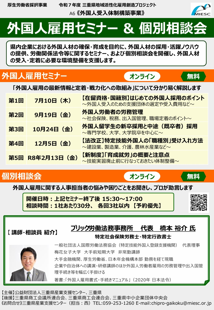 MIESC 公益財団法人三重県産業支援センター 【参加者募集】 「外国人雇用セミナー」および「個別相談会」を開催します | 技術・販路・経営・資金・人材育成