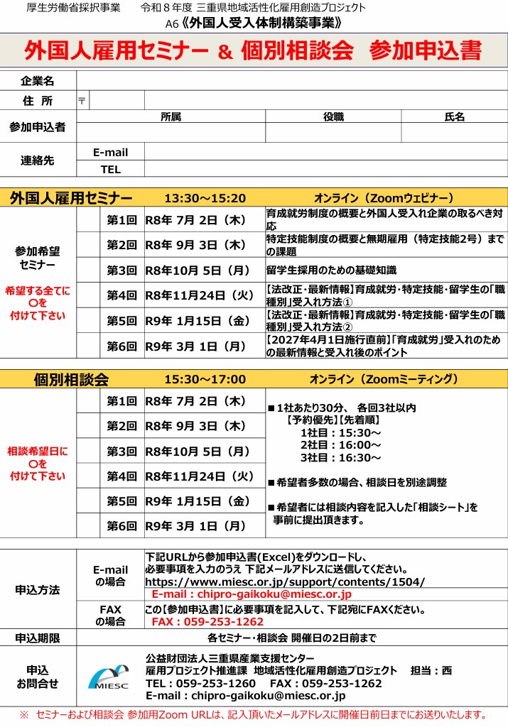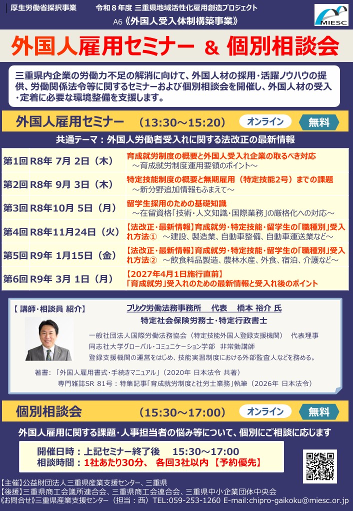 MIESC 公益財団法人三重県産業支援センター 【参加者募集】「外国人雇用セミナー」および「個別相談会」を開催します | 技術・販路・経営・資金・人材育成